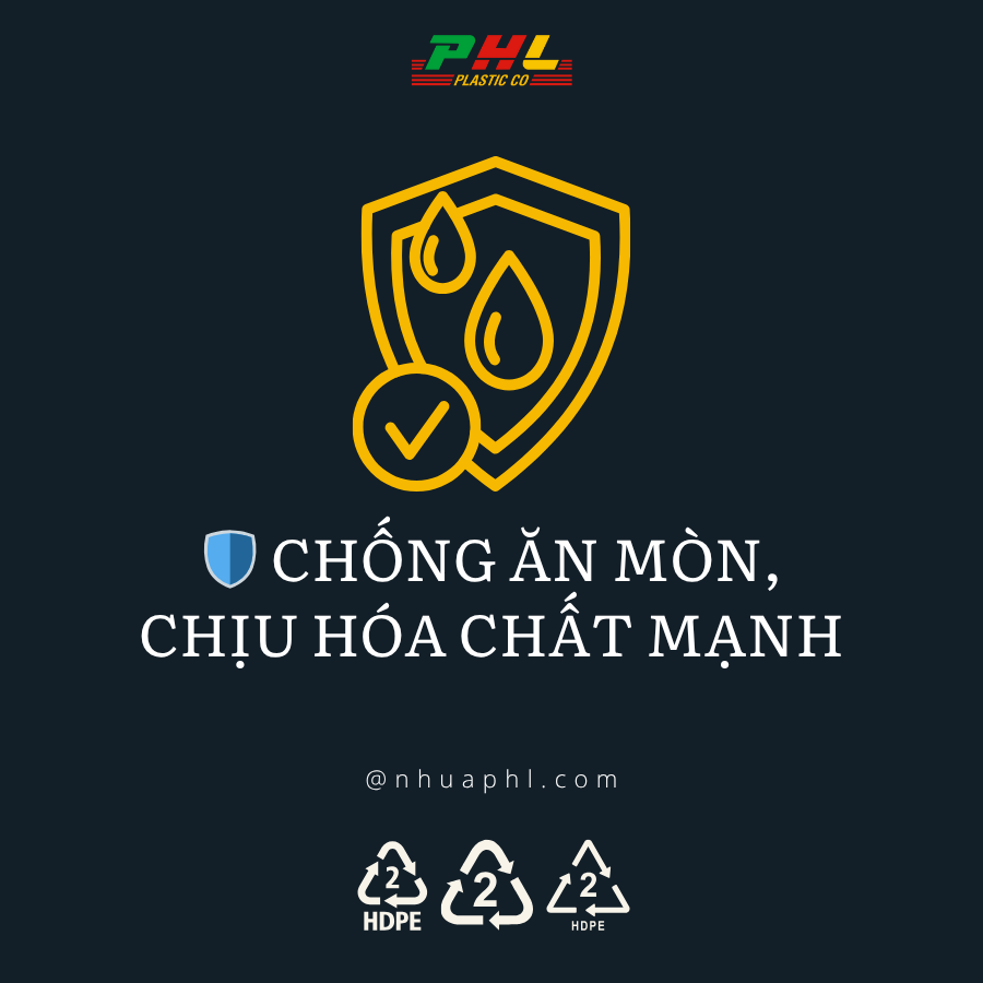 Nhựa HDPE (High Density Polyethylene) có khả năng kháng dung môi, axit và kiềm cực tốt, không bị phân hủy hay biến dạng khi tiếp xúc với các hoạt chất mạnh. Đây là lựa chọn hoàn hảo để chứa thuốc trừ sâu, phân bón lá, dung dịch trong thủy sản chăn nuôi,...