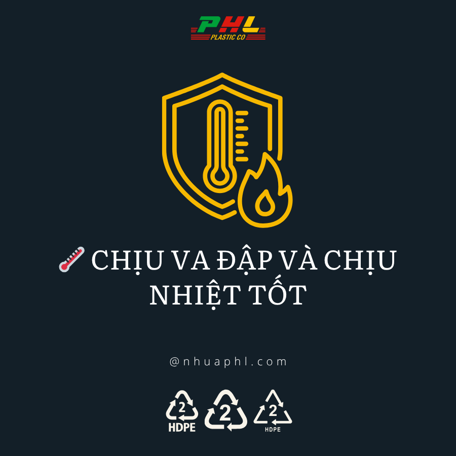 Nhờ cấu trúc phân tử bền vững, HDPE có thể chịu va đập mạnh, không nứt vỡ khi rơi và chịu được dải nhiệt độ rộng – phù hợp cho vận chuyển xa, thời tiết khắc nghiệt.
