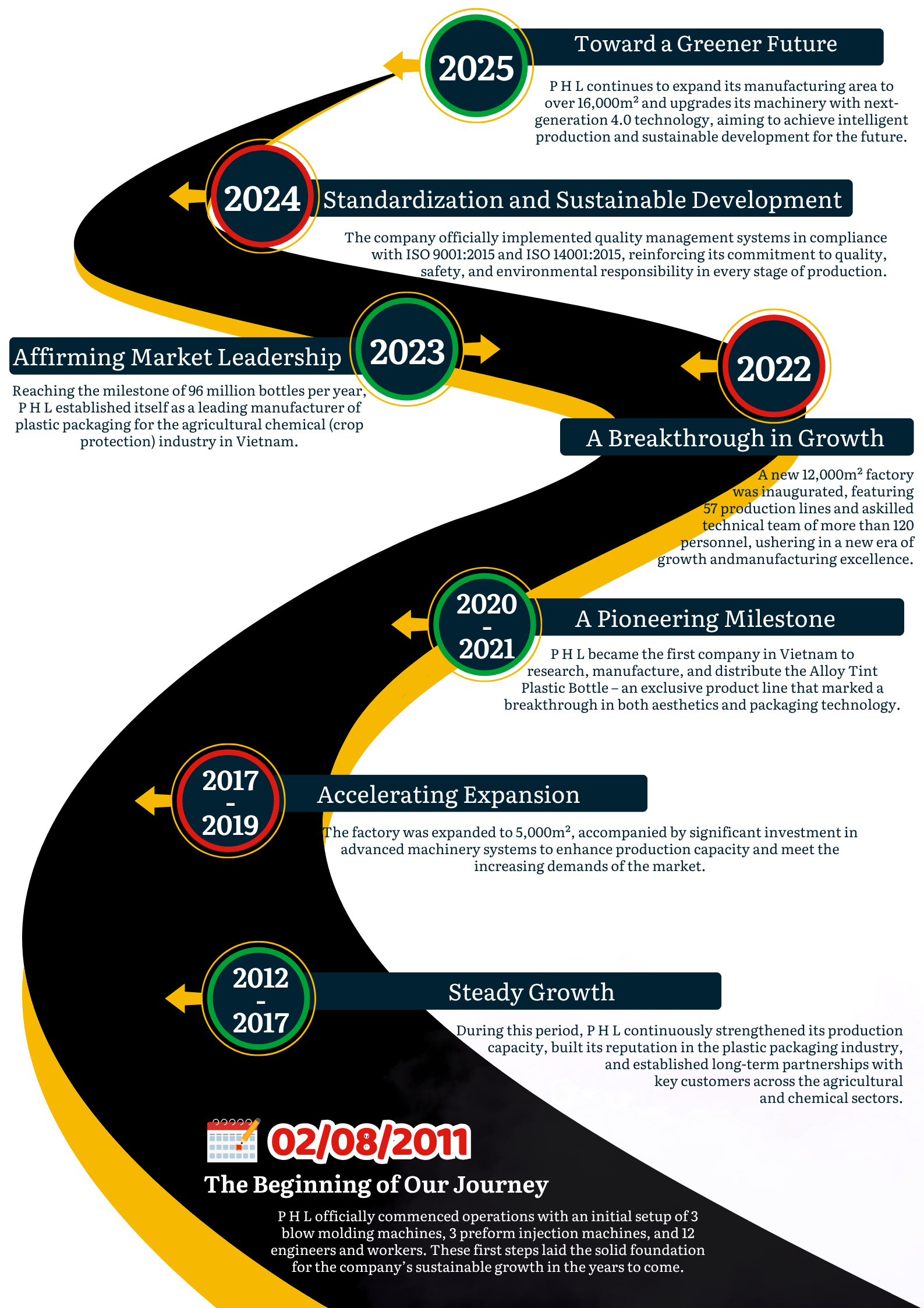 Over more than a decade of growth, P H L has continuously invested in technology, expanded production capacity, and perfected its quality management system. Our goal is to become a leading plastic packaging manufacturer in Vietnam and across Southeast Asia.